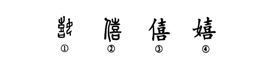 這個(gè)“嬉”字本為會(huì )意兼形聲的字。①是甲骨文的形體,左邊是“喜”,右邊是面朝左的婦女之形,表示“喜樂(lè )”之意。②是小篆的形體,“女”訛變?yōu)椤叭恕?,并移于“喜”之左,其義不變。③是楷書(shū)的寫(xiě)法。④是隸變后的寫(xiě)法(古代“人”、“女”互通)。