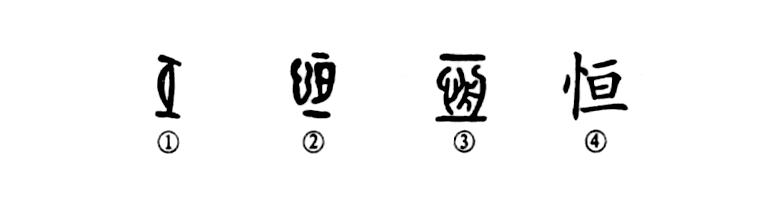 這是“持之以恒”的“恒”字,原為會(huì )意字。甲骨文①的中間是“月”,上下的兩條橫線(xiàn)表示界限,這就說(shuō)明月亮永遠在一定的范圍內運行,體現永恒之意。②是金文的形體,中間又增加一“心”字,表示“心”也要“恒”。③是小篆的形體,將“月”訛變?yōu)椤爸邸?。④為楷?shū)的寫(xiě)法。