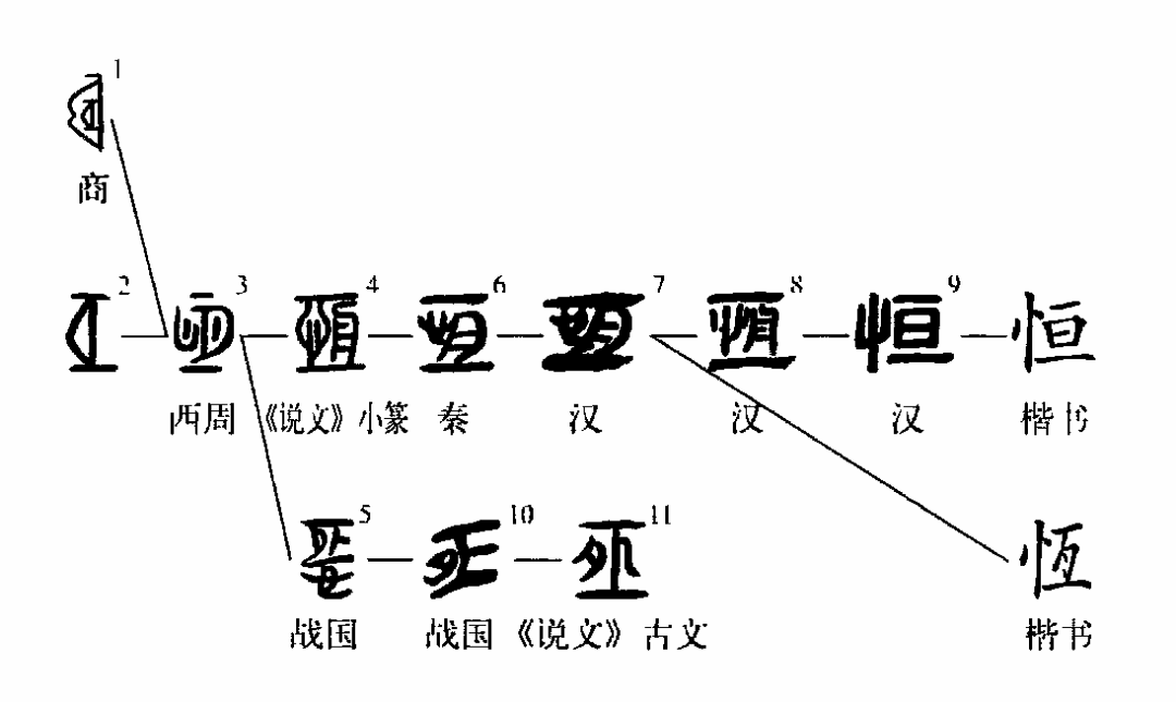 會(huì )意字。據《說(shuō)文》,此字“從心,從舟在二之間。上下心以舟施恒也。”段玉裁注云:“上下謂往復也。謂往復遙遠而心以舟運旋,歷久不變,恒之意也。”其說(shuō)頗迂曲。甲骨文從月在二之間,如字形2,當是取象于月在天地之間圓缺往復而寓永恒之意,《詩(shī)·小雅·天?!?/strong>有“如月之恒”的話(huà),正道出了恒字取象于月的寓意。甲骨文還有異體從弓,如字形1。毛傳解釋“如月之恒”中的“恒”為“弦”,鄭箋進(jìn)一步解釋為“月上弦而就盈”。弦本弓上物,故字又從弓。金文開(kāi)始增繁從心,如字形3,其義殆與恒心有關(guān)。月字舟字古文多混同,故《說(shuō)文》小篆訛從舟。秦漢文字或從月,如字形6;或從舟,如字形8;或從日,如字形9。從“舟”沿襲小篆之訛,從“日”則與從“月”相通??瑫?shū)作“恆”或“恒”。作“恆”者是從“月”或“舟”形體的變寫(xiě),作“恒”者則繼承了從“日”的寫(xiě)法?!墩滞āば牟俊芬浴昂恪睘椤皭a”的俗字,現以“恒”為規范正字。字形5、10、11是戰國楚系文字的特殊寫(xiě)法,郭店簡(jiǎn)、包山簡(jiǎn)很常見(jiàn)。其相同之處是從二從夕,古月、夕同字,故與從月無(wú)別。其不同之處是字形5從“心”并加“卜”,字形10、11則省去“心”符而留下“卜”符。此“卜”符如非贅筆飾畫(huà),其意難明?!昂恪钡谋玖x是月上弦而漸滿(mǎn)。《詩(shī)·小雅·天?!?/strong>:“如月之恒,如日之升。”日月經(jīng)天、陰晴圓缺乃是固定不變的規律,因而引申為長(cháng)久、恒心。《孟子·梁惠王上》:“無(wú)恒產(chǎn)而有恒心者,惟士為能。”再引申為普通的、平常的。作副詞,指經(jīng)常、常常。通“亙”,綿延、連續。《漢書(shū)·敘傳上》:“潛神默記,恒以年歲。”(林志強)