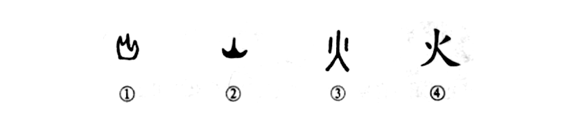 “烽火連三月,家書(shū)抵萬(wàn)金?!边@個(gè)“火”字是個(gè)象形字。甲骨文①就像火苗上冒的樣子。②是金文偏旁“火”(至今尚未發(fā)現金文中有獨體的“火”字)。從這個(gè)偏旁也足以看出火苗上冒的樣子。③是小篆的形體,還保留了一點(diǎn)火苗上冒的樣子??瑫?shū)④是直接由小篆演變而來(lái),結構完全一致。