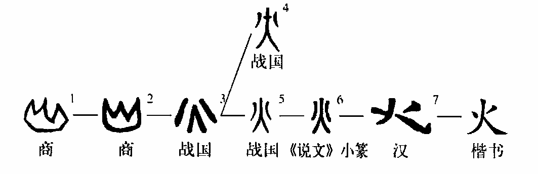 象形字。像物體燃燒時(shí)發(fā)出的光、焰之形。本義是火、火焰。《合集》2874:“丙寅卜,??貞:其有火? ”(丙寅日占卜,??貞:會(huì )有火?)《合集》 11503:“有新大晶(星)並火。”可能指的是火星。《書(shū)·盤(pán)庚上》:“若火之燎于原,不可向邇(靠近),其猶可撲滅?”《韓非子·五蠹》:“有圣人作,鉆燧取火,以化腥臊。”“火”的引申義較多,由火焰引申為著(zhù)火、火災等義,由火焰又可引申為火把、火炬、火藥、槍炮彈藥等義,由火的顏色可引申為火紅色,由火的旺盛引申為興旺或暴躁、怒氣,由著(zhù)火、火災的刻不容緩引申為緊急,茲不詳述?;鹂梢匀∨?,又可以照明,尤其可以燒烤食物,使生食轉為熟食,使人類(lèi)卓然超越于其他動(dòng)物之上,向文明社會(huì )挺進(jìn)。甲骨文字形像物體燃燒時(shí)光、焰迸射之形;戰國文字將火形拆成了四筆,但還保留了一點(diǎn)光、焰上冒的樣子;其后的字形與戰國文字一脈相承。(郭小武葉青)
