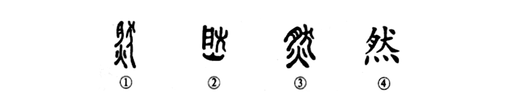 這是“燃燒”之“燃”的本字“然”,原為會(huì )意字。①是金文的形體,左上角是“肉”,右上部為“犬”,下部為“火”,表示以火燒犬肉。②也是金文的形體,其下部更像火苗上冒的形狀。③為小篆的形體。④為楷書(shū)的寫(xiě)法。