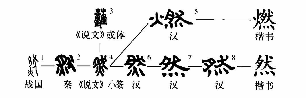 形聲字。從火,肰(rán)聲;或體為從艸、難聲的形聲字。徐鉉案語(yǔ):“艸部有?,注云艸也。此重出。”段玉裁注:“按,篆當作??;或古本作??,轉寫(xiě)奪火耳。”按照段注,《說(shuō)文》或體應作