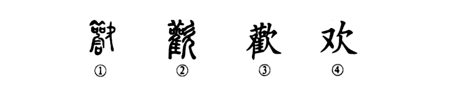 這是“歡天喜地"的“歡”字,本為形聲字。①是戰國璽印文的形體,左邊是“雚”字,表讀音,右邊是一個(gè)面朝左而站立的人,張口歡笑之形。②是小篆的寫(xiě)法,與璽印文相似。③是楷書(shū)繁體字。④是簡(jiǎn)化字。