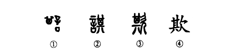 “貪財冒賄,欺罔視聽(tīng)?!边@個(gè)“欺”字本為形聲字。①是金文的形體。左邊為“其'表聲;右邊是“言”,表形。②是小篆的形體。③是小篆的異體字?!把浴迸c“人”有關(guān),“欠”本為“人”形,所以小篆即以“欠”代替了金文中的“言”,其義未變。本為以言騙人,后又以人行騙。④是楷書(shū)的寫(xiě)法。