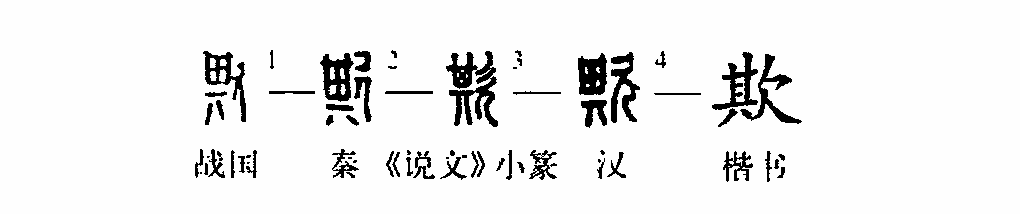 形聲字。《說(shuō)文》:“欺,詐欺也。從欠,其聲。”嚴可均說(shuō)文校議:“《韻會(huì )》引作:詐也。”段玉裁注從之刪“欺”字:“言部曰:詐者,欺也。從欠猶從言之義。”張舜徽約注:“言部:‘諆,欺也?!松w詐欺本字,與詐從言同意。欺從欠,則與虧部虧訓氣損義近。今俗稱(chēng)所為欺人之事為虧心事,謂于內心有所損也,欺、虧雙聲,語(yǔ)之轉耳。”戰國文獻習見(jiàn)欺字用為欺詐、欺騙之義。諆、欺聲符相同,意符相近,故通用無(wú)別。張舜徽推測欺字之本義與虧(氣損)義相近,只可備一說(shuō)而已。(周寶宏)