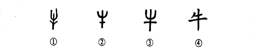 “橫眉冷對千夫指,俯首甘為孺子牛?!边@個(gè)“?!弊质莻€(gè)象形字。甲骨文①是正面看牛頭的形象,兩側向上彎的部分是一雙牛角,牛角之下向斜上方伸展的兩筆是牛的一雙耳朵。金文②的形體也基本上同于甲骨文,只是將牛耳拉平,成為一條橫線(xiàn)。小篆③與金文的形體相類(lèi)似。④是楷書(shū)寫(xiě)法,根本看不出牛頭之形了。