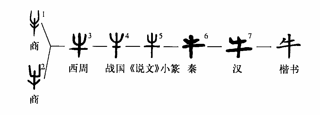 象形字。字像牛頭形,本義就是牛,是把客觀(guān)物體最具特征的一部分描繪下來(lái),與“羊”造字方法相同。甲骨文、金文中用的都是本義。《陳》 30:“甲戌卜貞,翌乙亥?(?指侑祭)于祖乙三牛。”小盂鼎:“俘牛三百五十五牛。”金文中牛還可作為賞賜品。