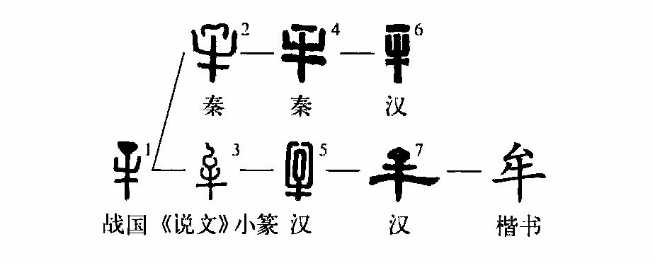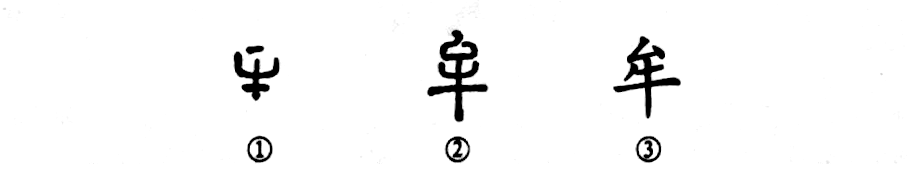 這個(gè)“牟”字讀作móu,原為象形字。①為金文的形體。牛頭上的一橫畫(huà)表示牛叫時(shí)所發(fā)出的聲氣。②是小篆的寫(xiě)法,牛頭之上的一橫畫(huà)變?yōu)椤佰獭?,更藝術(shù)化了。③是楷書(shū)的寫(xiě)法。