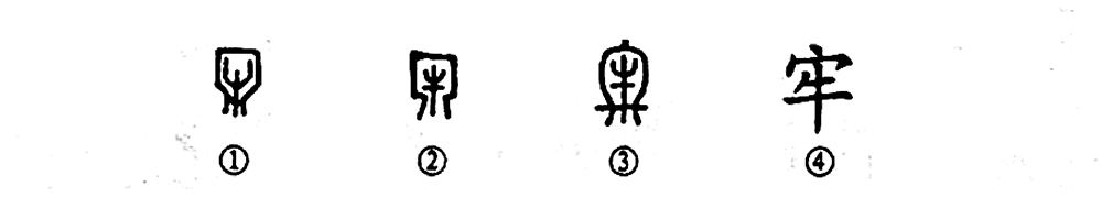 這個(gè)“亡羊而補牢”的“牢”字是個(gè)會(huì )意字。甲骨文①的外面像飼養牲畜的欄圈,其中間是“?!?,也就是把“?!标P(guān)在欄中之義。金文②的形體與甲骨文的形體基本一致。③是小篆的寫(xiě)法,把牛關(guān)在欄中,在欄門(mén)上再橫上一塊大木頭,牛跑不出來(lái),可謂牢固了。④是楷書(shū)的寫(xiě)法,從“宀”從“?!碑斎蝗允且粋€(gè)會(huì )意字。