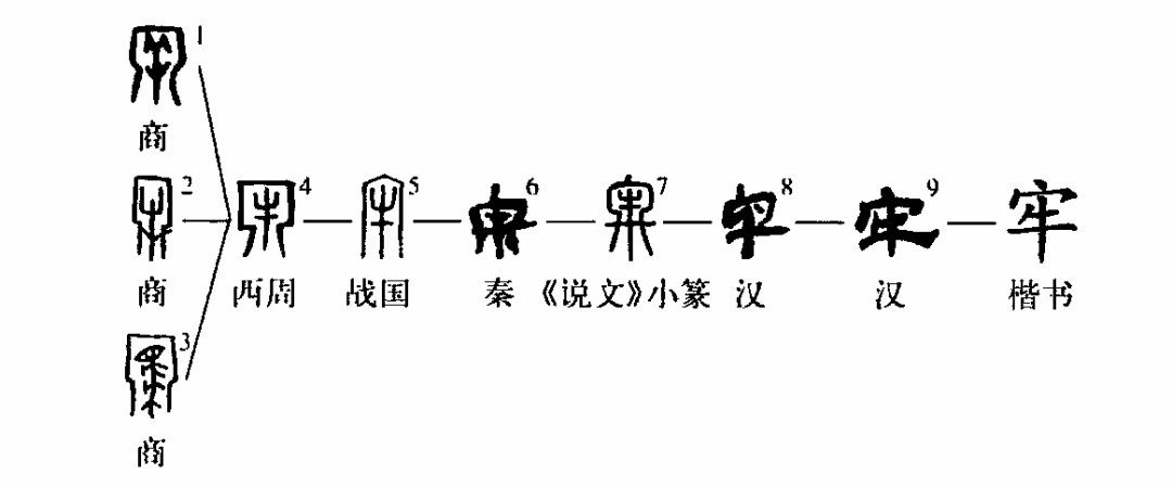 像圈欄之形。 《說(shuō)文》小篆因秦簡(jiǎn)寫(xiě)法而誤增一筆,許慎遂以為從冬省,非是。睡虎地秦簡(jiǎn)是處于隸變中的文字,它包含有篆體和隸體兩重因素,即篆、隸合一,李斯所制小篆即源于其篆體因素。睡簡(jiǎn)和小篆時(shí)代相近,《漢語(yǔ)大字典》排列字形依時(shí)代先后均把睡簡(jiǎn)文字置于《說(shuō)文》小篆后,但從實(shí)際的文字形體演變角度考慮,不能如此拘泥,應依從文字形體發(fā)展的實(shí)際脈絡(luò ),或置于小篆后,或置于小篆前。本條置于小篆前,所謂從冬省便可做出一個(gè)合理的解釋?!袄巍弊直玖x指養牛、羊、馬等牲畜的圈欄。《說(shuō)文》:“牢,閑,養牛馬圈也。”《詩(shī)·大雅·公劉》:“執豕于牢。”然甲骨文中不用本義,而是用其引申義,指關(guān)養于圈欄中之牛羊馬。古代祭祀,對于圈養之牛與非圈養之牛區分甚嚴。據卜辭所反映的情況,殷人稱(chēng)普通的牛為“?!?,它們可能是普通牧放中的牛,也可能是臨時(shí)征收來(lái)的。而牢是經(jīng)過(guò)特殊飼養的牛,作為祭牲,用“牢”要比用“?!甭≈?。這種經(jīng)過(guò)特殊飼養的牛,其大者謂之“大牢”,其小者謂之“小牢”,傳世文獻中稱(chēng)牛羊豕各一為大牢,羊豕各一為少牢,原是秦漢以來(lái)的一種說(shuō)法,并不符合殷商禮制。甲骨文中字或從羊作,亦或從馬,構意與牢同,其構形可與甲骨文之“牡”、“牝”等相參。由牢閑義引申出牢獄義。牢用來(lái)關(guān)養牲畜,為防止其逃跑,要修得牢固,因此又引申出牢固義。(陳英杰)