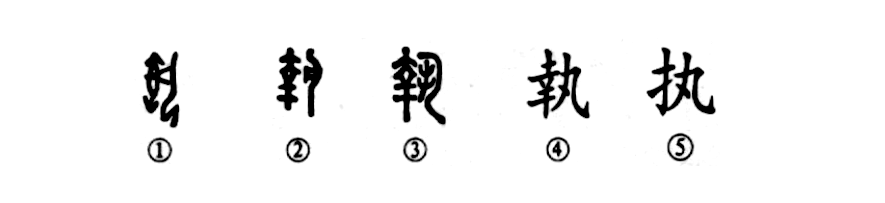 “官不過(guò)侍郎,位不過(guò)執戟?!边@個(gè)“執”字本為會(huì )意字。①是甲骨文的形體,左邊是類(lèi)似手銬一類(lèi)的刑具,右邊是一個(gè)面朝左半跪著(zhù)的人,雙手被手銬鎖住。②是金文的形體,與甲骨文相似。③是小篆的寫(xiě)法,左邊的刑具和右邊的人都失去了原形。④為楷書(shū)的繁體字。⑤為簡(jiǎn)化字。
