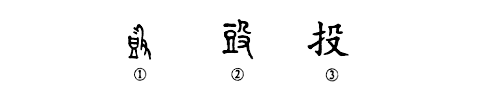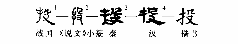 這是“投筆從戎”的“投”字,是個(gè)會(huì )意字。甲骨文①的左邊是“豆”,右邊是“殳”,表示“敲擊”義。②是小篆的形體,由甲骨文直接演變而來(lái)。③是楷書(shū)的寫(xiě)法,將“豆”換成提手旁。