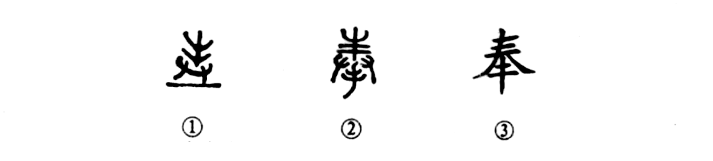 這個(gè)“奉”字本為會(huì )意兼形聲的字。①是金文的形體,上部為“豐”,表聲,也表示所捧之物;下部為兩手形,表示雙手捧物。②是小篆的形體,其下部為三手之形。③是楷書(shū)的寫(xiě)法。