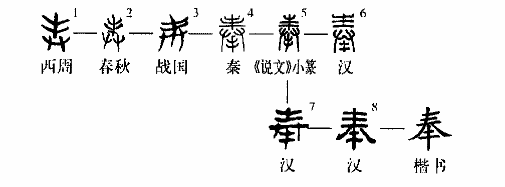《說(shuō)文》:“奉,承也?!逼鋵?shí)“承”是引申義,“奉”的本義應為“捧”,如《韓非子?和氏》:“楚人和氏得玉璞楚山中,奉而獻之厲王。”又如《史記?廉頗藺相如列傳》:“臣愿奉璧往使。”所謂“奉璧”也就是雙手捧著(zhù)玉璧。由此又可以引申為“獻”,如《周禮?地官?大司徒》:“祀五帝,奉牛牲。”由“獻”可以引申為“給予”,如《左傳?僖公三十三年》:“天奉我也。”也就是說(shuō):這是老天給予我的。由“給予”引申為“供給”,“供養”,如王符《潛夫論?浮侈》:“以一奉百。”