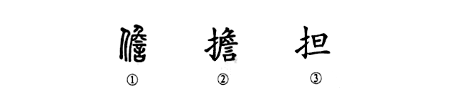 這是“勇?lián)厝?rdquo;的“擔”字,本為形聲字。①是小篆的形體,為左形右聲的形聲字。②是楷書(shū)繁體字,左邊由“人”變成了“手”,但仍為形聲字。③為簡(jiǎn)化字。