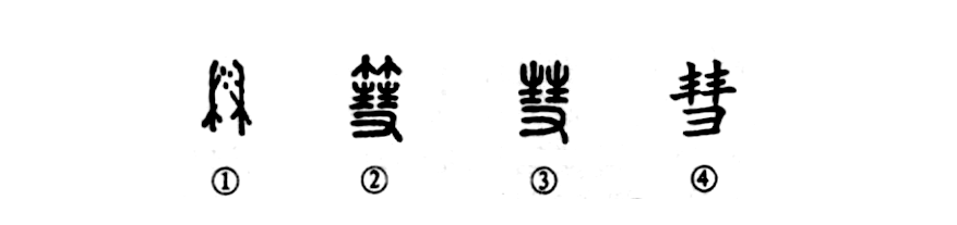 “昭王擁彗先驅。”這個(gè)“彗”字本為會(huì )意字。①是甲骨文的形體,像兩把掃帚,上部中間的三個(gè)點(diǎn)兒指灰塵??傮w表示以帚掃除塵灰。商承祚認為:“下掃謂之掃,上掃謂之彗。”②是小篆異體字,其上增加“竹”,表示掃帚是用竹做成,中間是掃帚的訛變之形,下邊為一只手(又)。③是小篆的形體,上部無(wú)“竹”。④為楷書(shū)寫(xiě)法。