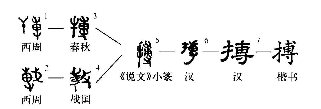 ?形聲字。從手,尃聲。金文從干,尃聲,或從戈,尃聲。干、戈表意同類(lèi),均為武器。戰文形體變從戈為從攴,石鼓文形體左邊的“干”則訛變?yōu)?ldquo;牛”。小篆的形體由“牛”又變?yōu)?ldquo;手”,改為從手尃聲。《說(shuō)文》:“搏,索持也。一曰至也。”段玉裁注:“搏,??持也。??,各本作索,今正。入室搜曰??。??持,謂摸索而持之。”《集韻·遇韻》:“搏,捕也。”指搜捕,捕捉。 《國語(yǔ)·晉語(yǔ)八》:“平公射??(yàn),不死,使豎襄搏之。”但由金文的形體看,《說(shuō)文》所釋非本義,“搏”的本義應是“搏斗”。對打,相斗。《廣雅·釋詁三》:“搏,擊也。”《左傳·僖公二十八年》:“晉侯夢(mèng)與楚子搏。”杜預注:“搏,手搏。” “捕捉”應是“搏斗”的引申義。由捕捉可引申為執持,握持。《呂氏春秋·首時(shí)》:“伍子胥說(shuō)之半,王子光舉帷,搏其手而與之坐。”高誘注:“搏執子胥之手,與之俱坐,聽(tīng)其說(shuō)。”又可引申為攫取,拾取。《史記·李斯列傳》:“鑠金百溢,盜跖不搏。”司馬貞索隱:“搏猶攫也,取也。凡鳥(niǎo)翼?yè)粑镌徊?,足取曰攫,故人取物亦謂之搏。”(荊亞玲 蔣曉薇)