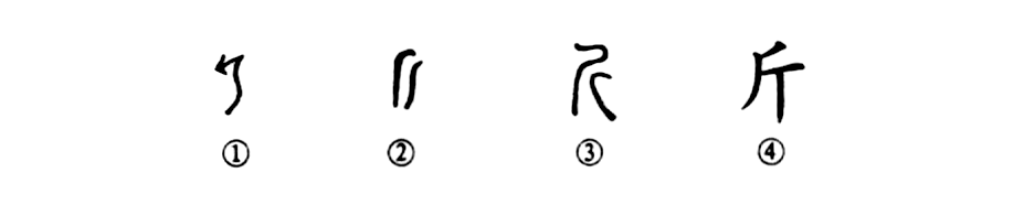 這是“運斤(斧子)成風(fēng)”的“斤”字。甲骨文①的上部是橫刃朝左、下部有一條曲柄的大斧頭,可見(jiàn)這是一個(gè)像斧子形狀的象形字。所以在上古“斤”就是大斧,是一種武器。金文②是刃朝右的兩把大斧子。到了小篆③雖然形體很美觀(guān),但卻不像斧子了??瑫?shū)④則完全走樣了。
