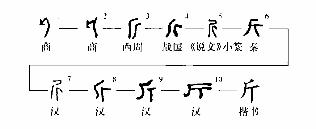 象形字。《說(shuō)文》:“斤,斫木也,象形。凡斤之屬皆從斤。”段王裁注:“斤,斫木斧也。此依小徐本,凡用斫物者皆曰斧,斫木之斧則謂之斤。”徐灝段注箋:“斧斤同物,斤小于斧,斤字又通作釿。”從西周早期金文征人鼎中的“斤”字開(kāi)始就已經(jīng)看不出象形,至《說(shuō)文》篆文“斤”字形體更是如此。甲骨文的“斤”字形體明顯為象形字,甲骨文兵、?、新、折等字,皆從
