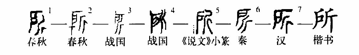 形聲字。《說(shuō)文》:“所,伐木聲也。從斤,戶(hù)聲。《詩(shī)》曰‘伐木所所。’”段玉裁注:“伐木聲乃此字本義,用為處所者假借為処字也。若王所行在所之類(lèi)是也。用為分別詞者,又從処所之義引申,若予所否者、所不與舅氏同心者之類(lèi)是也。皆于本義無(wú)涉,是真假借矣。”桂馥義證:“《詩(shī)》曰伐木所所者,《小雅·伐木》文,彼作許許,許所聲相近。”按:“所所”與“許許”都是狀伐木之聲,應該都是借用。所字在傳世和清末以來(lái)發(fā)現的西周金文中僅宋代著(zhù)錄的西周晚期敔簋銘文有“所”字:“奪俘人四百,廩于榮伯之所。”傳世文獻中,西周中晚期文獻《詩(shī)·大雅》,已習見(jiàn)“所”字用為處所之所。(陳英杰)