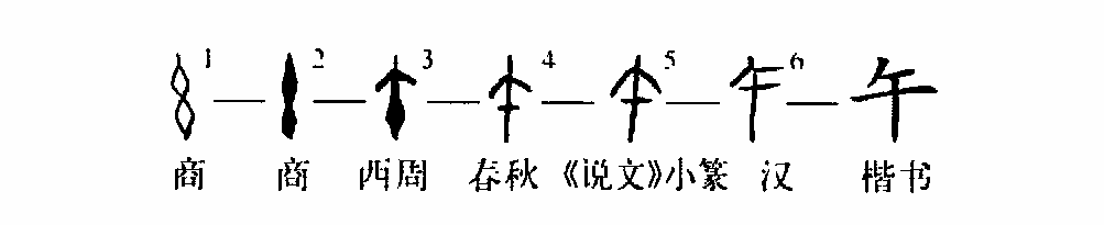 象形字。字在甲骨文、金文中像杵形,假借為地支的第五位,用于紀月,指農歷五月;用以紀時(shí),指十一時(shí)至十三時(shí);在太歲紀年法中又用以紀年,《爾雅·釋天》:“太歲在午曰敦牂。”與天干相配,可用以紀年,亦可用以紀日。(李義海)