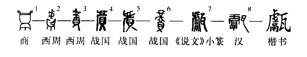 象形字。商代金文“甗”字像炊器之形,上部是透底的甑,下部是鬲。西周金文已加注“虍”聲。戰國文字“甗”字從貝(鼎之訛體)、虍聲?!墩f(shuō)文》篆文贅加“瓦”,變?yōu)閺耐?、鬳聲之字。鬳、甗本是一字,《說(shuō)文》分列二處。《說(shuō)文》:“甗,甑也。”本義是青銅或陶制炊器。王孫壽甗:“自乍(作)飤甗。”《左傳·成公二年》:“齊侯使賓媚人賂以紀甗、玉磬與地。”(徐在國)