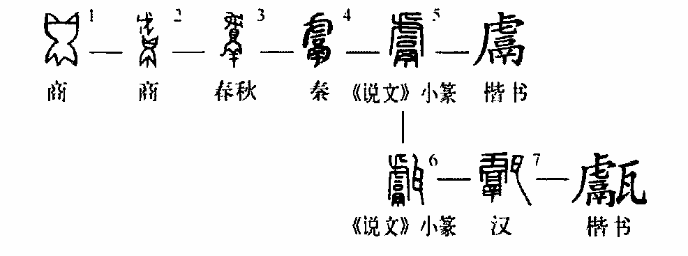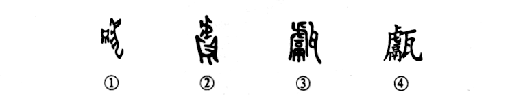這個(gè)“甗”字讀作yǎn,本為會(huì )意字。①是甲骨文的形體,左邊是一只大鼎,右邊是一只虎,表示以鼎烹虎。②是金文的形體,將虎頭放在鼎中,更有烹煮之意。③是小篆的形體,虎頭之下為“鬲”,右邊又增一“瓦”字,變成了會(huì )意兼形聲(右形左聲)的字,復雜化了。④為楷書(shū)的形體。