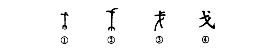 這是“躍馬橫戈”的“戈”字。甲骨文①就是“戈”的象形字。金文②的上部是“戈”的鋒利的“刃”,下部是“戈”的長(cháng)柄,也是像“戈”的樣子??墒切∽劬筒幌窳?。④是楷書(shū)的形體。