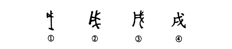 “戌”字讀作xū,是古代的一種兵器,是個(gè)象形字。①是甲骨文,上部朝左的部分是平口斧頭,下部是一條長(cháng)柄。②是金文,斧頭部分較大,但基本上同于甲骨文的形體。③是小篆的形體。④為楷書(shū)的寫(xiě)法。