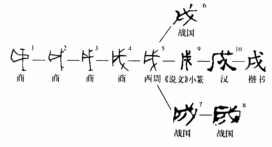 “戌”字的本義為“兵器”,但這個(gè)本義早已不復存在。《說(shuō)文》:“戌,滅也。”這個(gè)義項是從兵器的本義引申出來(lái)的。后世的常用義倒是它的假借義,即代表地支的第十一位;也是一日內的十二時(shí)辰之一,“戌時(shí)”相當于現在晚上的七時(shí)至九時(shí)。