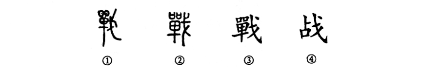 這是“鏖戰沙場(chǎng)”的“戰”字。本為會(huì )意兼形聲的字。①是金文的形體,左邊為“單”,右邊為“戈”。“單”的本義是捕捉工具,亦表聲,加“戈”突出了作戰之意。②是小篆的形體。③是楷書(shū)的形體。④為簡(jiǎn)化字,是一個(gè)單純的形聲字了。
