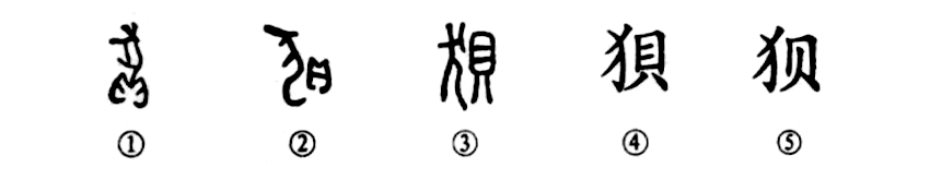 這是“狼狽為奸”的“狽”字,本為形聲字。①是甲骨文的形體。頭朝上的一只狽(似狼),拖著(zhù)一條大尾巴,尾巴的下端有個(gè)“貝”,表讀音。②是金文的形體,變上下結構為左右結構,但字義不變。③是小篆的形體.與金文一致。④為楷書(shū)繁體字。⑤為簡(jiǎn)化字。