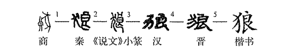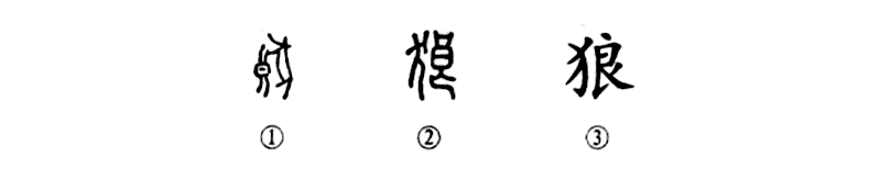 “是乃狼也,其可畜乎?”這個(gè)“狼”字本為形聲字。①是甲骨文,左邊的 “良”字表音;右邊為頭朝上的“狼”形。②是小篆的形體,因“狼”似 “狗”,所以左邊變?yōu)?ldquo;犬”,右邊仍為“良”。③是楷書(shū)的寫(xiě)法。