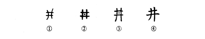 “吃水不忘打井人。”自古以來(lái),“井”與人民的生活緊密相聯(lián)。甲骨文①就像一個(gè)方口水井。金文②在井的中心加了一個(gè)點(diǎn)兒,表示這是水的所在,所以“井”字是個(gè)指事字。③是小篆的形體,與金文相同??瑫?shū)④則把其中的點(diǎn)兒去掉,為了書(shū)寫(xiě)方便。