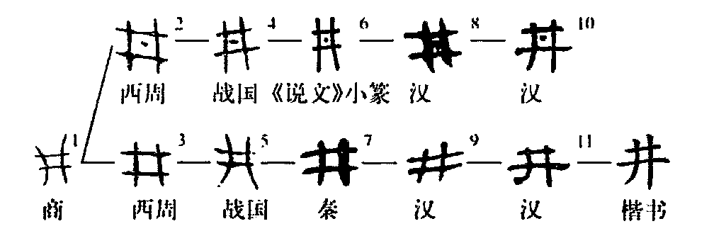 象形字。《說(shuō)文》:“象構韓(井欄)形。”用四木交搭像井口圍欄。“井”字早已行于商代,入西周后,或在中空處添加圓點(diǎn)為飾,《說(shuō)文》以為“甕(汲瓶)之象也”,可備一說(shuō)。西周中晚期,不加飾點(diǎn)的字形和加飾點(diǎn)的字形曾出現過(guò)分化寫(xiě)詞的趨勢,但最終沒(méi)能成功。僅有一點(diǎn)之差的繁簡(jiǎn)二體卻并行至東漢??瑫?shū)從簡(jiǎn),取中間無(wú)點(diǎn)的形式為規范。本義是水井。《易·井》:“改邑不改井。”(改建城邑而不改水井)詞義縮小,就僅指井欄。井欄不能隨意越過(guò),因此引申為法度、法則、懲罰,這些意義在周金文多有用例,而在典籍則寫(xiě)作“刑”或“型”。“井”由本義比喻引申,可指類(lèi)似井的建筑,如鹽井、礦井、天井等。先秦用“井”字字形描述一種土地制度——井田制:把一里見(jiàn)方的土地劃分成如“井”字形的九塊,每塊百畝,八家各分一塊,中間一塊為公田,所以《說(shuō)文》說(shuō)“八家一井”。(金國泰)