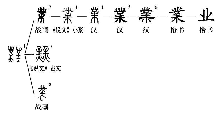 ”。《說(shuō)文》小篆及漢代篆隸的“業(yè)”字下部是訛變之形。“從丵,從巾,巾象版”的分析,是據訛變字形立說(shuō),不可信。但說(shuō)“業(yè)”的本義是“大版”,與古文字字形和文獻用例相吻合。“業(yè)”是新造的簡(jiǎn)化字。(李守奎)