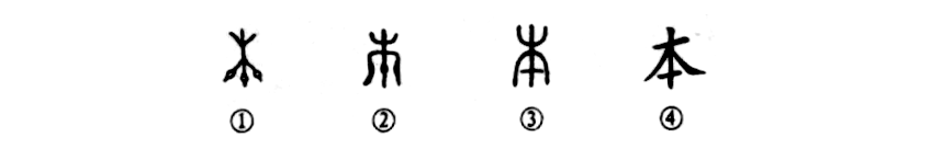 這是“根本”的“本”字。你看甲骨文①的上部是“木”(樹(shù)),下面根部的三個(gè)小圓圈是指事符號,表示這里是樹(shù)木的根部所在。金文②則變成三個(gè)小黑點(diǎn)兒,意思一樣,上為“木”,下為根。小篆③則把根部的三個(gè)點(diǎn)連成了一條線(xiàn),同樣是指事符號,表明根部所在。④是楷書(shū)形體,是“木”下加一橫。由此可見(jiàn),“本”字是個(gè)指事字。后世則把“根”與“本”連在一起構成一個(gè)復音詞,叫作“根本”。