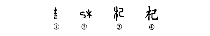 這是“杞國無(wú)事憂(yōu)天傾”的“杞”字,讀作qǐ,是個(gè)形聲字。甲骨文①的上部是“木”,下部是“己”。②是金文的形體,左“己”右“木”。③是小篆的形體,其結構位置與金文正相反。④是楷書(shū)的寫(xiě)法。
