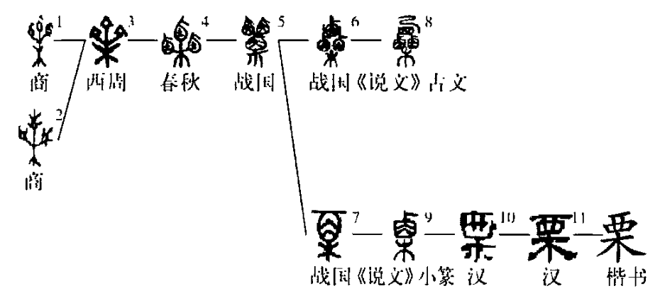 ”,與《說(shuō)文》相似。《說(shuō)文》:“栗,木也。從木,其實(shí)下垂。故從??。