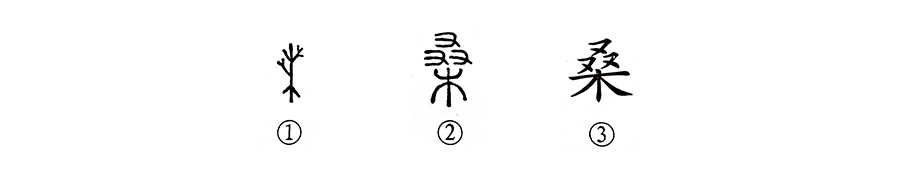 “開(kāi)軒面場(chǎng)圃,把酒話(huà)桑麻。”這個(gè)“桑”字本為象形字。甲骨文①上部為樹(shù)冠,下部有樹(shù)根,多像一棵樹(shù)?、谑切∽男误w,上部的樹(shù)枝形訛變?yōu)槿齻€(gè)“又”,其本義并未變。③是楷書(shū)的寫(xiě)法。