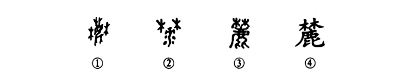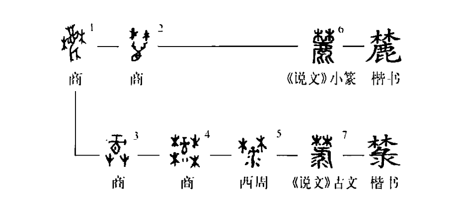 形聲字。商代甲骨文或從林、鹿聲(字形1。字形2省去了像鹿身的部分),或從林、錄聲(字形3。參見(jiàn)錄部“錄”字條。字形4從四木,與從“林”同意)。前者演變?yōu)椤墩f(shuō)文》小篆,后者演變?yōu)槲髦芙鹞暮汀墩f(shuō)文》古文。古書(shū)中通用“麓”字。本義指生長(cháng)在山腳的林木。《說(shuō)文》:“麓,一曰林屬,于山為麓。”《周禮·地官·敘官》“林麓”鄭玄注:“竹木生平地曰林,山足曰麓。”引申指看守山林苑囿的官吏。《說(shuō)文》:“麓,守山林吏也。”《國語(yǔ)·晉語(yǔ)九》:“主將適螻而麓不聞。”韋昭注:“螻,晉君之囿。麓,主君苑囿之官。”又指山腳。《玉篇·林部》:“麓,山足也。”《詩(shī)·大雅·旱麓》:“瞻彼旱麓。”毛傳:“麓,山足也。”(冀小軍)