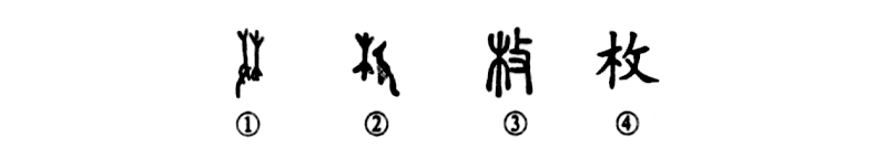 “風(fēng)入園林寒漠漠,日移宮殿影枚枚。”這個(gè)“枚”字本為會(huì )意字。①是甲骨文的形體,左邊像手執工具撲打右邊的樹(shù)木。②是金文的形體,左邊為樹(shù)木之形,右邊是手執一把大砍刀向樹(shù)干砍去。③是小篆的形體,其右邊變?yōu)?ldquo;攴”,意義沒(méi)有變。④是楷書(shū)的寫(xiě)法。