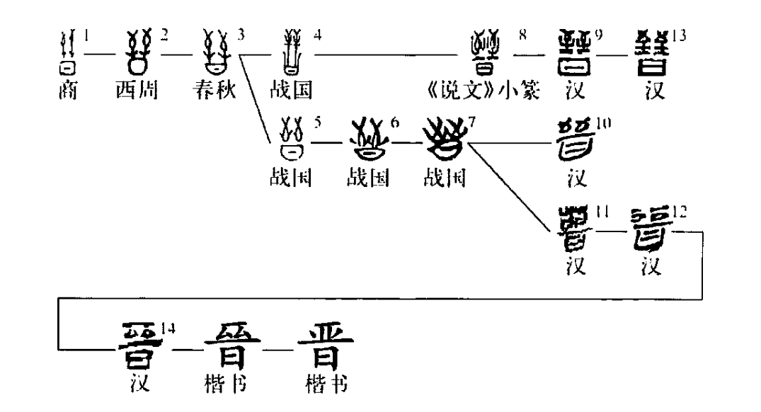 會(huì )意兼形聲字。初文從二“矢”,從日。后來(lái)二“矢”逐漸演變?yōu)?ldquo;臸”字。甲骨文:“……晉扶……”(《合集》19568)古文字中多用為地名,指兩周時(shí)期的晉國。晉公盆:“晉邦維翰。”(《集成》16.10342)《說(shuō)文》:“