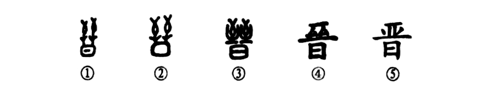 這個(gè)“晉”字是個(gè)會(huì )意字。甲骨文①上為兩矢,下為“日”,實(shí)為一器物,好像兩矢插進(jìn)器中之形。②是金文的形體,下部更像器形。③是小篆的寫(xiě)法,與甲骨文相似。④是楷書(shū)繁體字的寫(xiě)法。⑤為簡(jiǎn)化字。