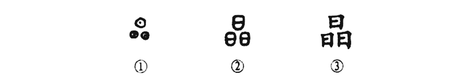 這是“亮晶晶”的“晶”字。甲骨文①的形體是三個(gè)太陽(yáng)堆在一起。本來(lái)一個(gè)太陽(yáng)就夠亮的了,那么三個(gè)太陽(yáng)就更亮了,所以《說(shuō)文解字》說(shuō):“晶,精光也,從三日。”這種三個(gè)同樣的字所組成的會(huì )意字,就叫“同體會(huì )意字”。小篆②和楷書(shū)③也是三個(gè)“日”字。所以“晶”字的本義是“光亮晶瑩”的意思。