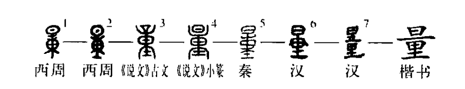 構形不明。《說(shuō)文》認為本義是“稱(chēng)輕重”,構形是“從重省,曏省聲”。于省吾《甲骨文字釋林》云:“(量)從重從日,乃會(huì )意字。”“量所以量度物之多少輕重。”“其從日,系露天量度之意。”(董蓮池)