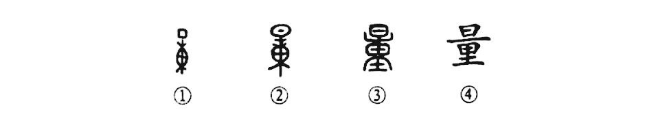 這是“量體裁衣”的“量”字,是一個(gè)會(huì )意字。甲骨文①的上部為“日”形,下部為“東”。于省吾先生認為:這是“露天從事量度之義”。②是金文形體,上部為“日”形,下部為“重”的初文。③是小篆的寫(xiě)法。④為楷書(shū)寫(xiě)法。