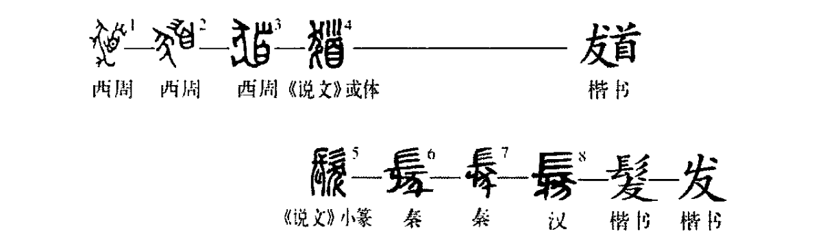 形聲字。《說(shuō)文》:“髮?zhuān)?。從髟,犮聲?/span>??,髮或從首。”桂馥義證:“根也者,本書(shū)茇從犮,云草根也。犮聲者,《釋名》:髮?zhuān)我?,拔擢而出也?/strong>”這是從聲音上訓釋髮的命名來(lái)源,其本義即頭發(fā)?!墩f(shuō)文》小篆髮之或體??字見(jiàn)于西周金文,正用為頭發(fā)之義,但西周金文??字,從首從犬。秦簡(jiǎn)髮字形體皆不從“彡”,漢初帛書(shū)形體也是如此,當為省體。(周寶宏)