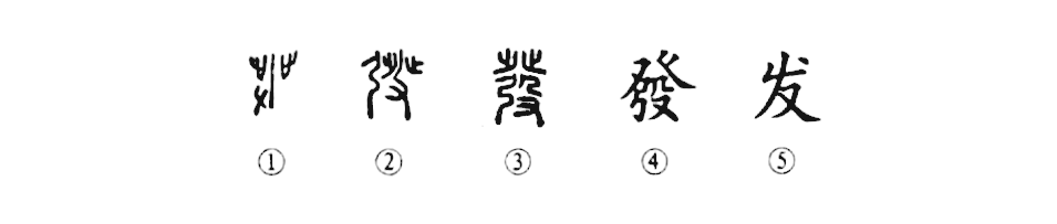 這是“朝發(fā)夕至”的“發(fā)”字,本為會(huì )意字。甲骨文①左下方是一只左手,手執一長(cháng)棒,棒的左右是兩只腳,這是執棒前進(jìn)的意思。②是金文的形體,又在其左側增加了一張“弓”,持武器前進(jìn)之意更加明顯。③為小篆的形體,“弓”已移到兩腳之內,同時(shí)又將手持棒的形體變?yōu)?ldquo;殳(shū)”(殳也為古代的一種武器),仍為持武器出發(fā)之意。④是楷書(shū)的形體,⑤為簡(jiǎn)化字。